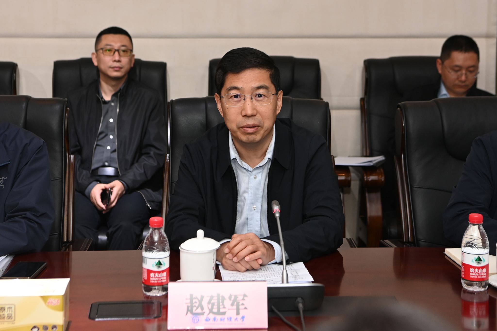 赵建军代表学校对魏秦歌一行表示热烈欢迎,并简要介绍了学校历史、办学特色和国有资产管理基本情况。他指出,国有资产是学校高质量发展的物质基础,学校历来高度重视国有资产管理工作,坚持规范管理和提高效率有机结合,不断优化体制机制,努力实现国有资产“管得好、用得活、效益高”。
