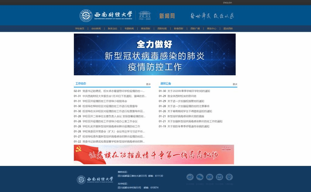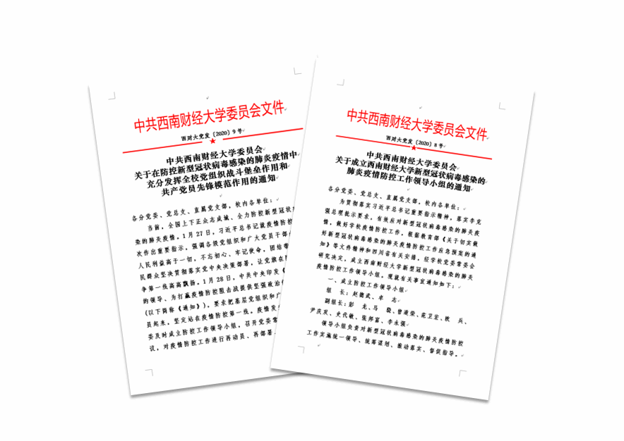 新型冠状病毒感染的肺炎疫情发生以来,习近平总书记始终高度重视,多次召开会议、多次听取汇报、作出重要指示,为全面做好疫情防控工作指明了方向,坚定了信心。西南财经大学党委始终高度重视疫情防控工作,严格按照中央和教育部党组、四川省委省政府部署要求,坚持统一领导、靠前指挥、迅速应对,在疫情防控斗争中充分发挥全校各级党组织战斗堡垒作用和广大党员先锋模范作用,带领全校沉着冷静、全力以赴、精准施策、严密防控,科学有序推进疫情防控各项举措,让党旗在校园防控疫情斗争第一线高高飘扬,全力打好疫情防控阻击战。