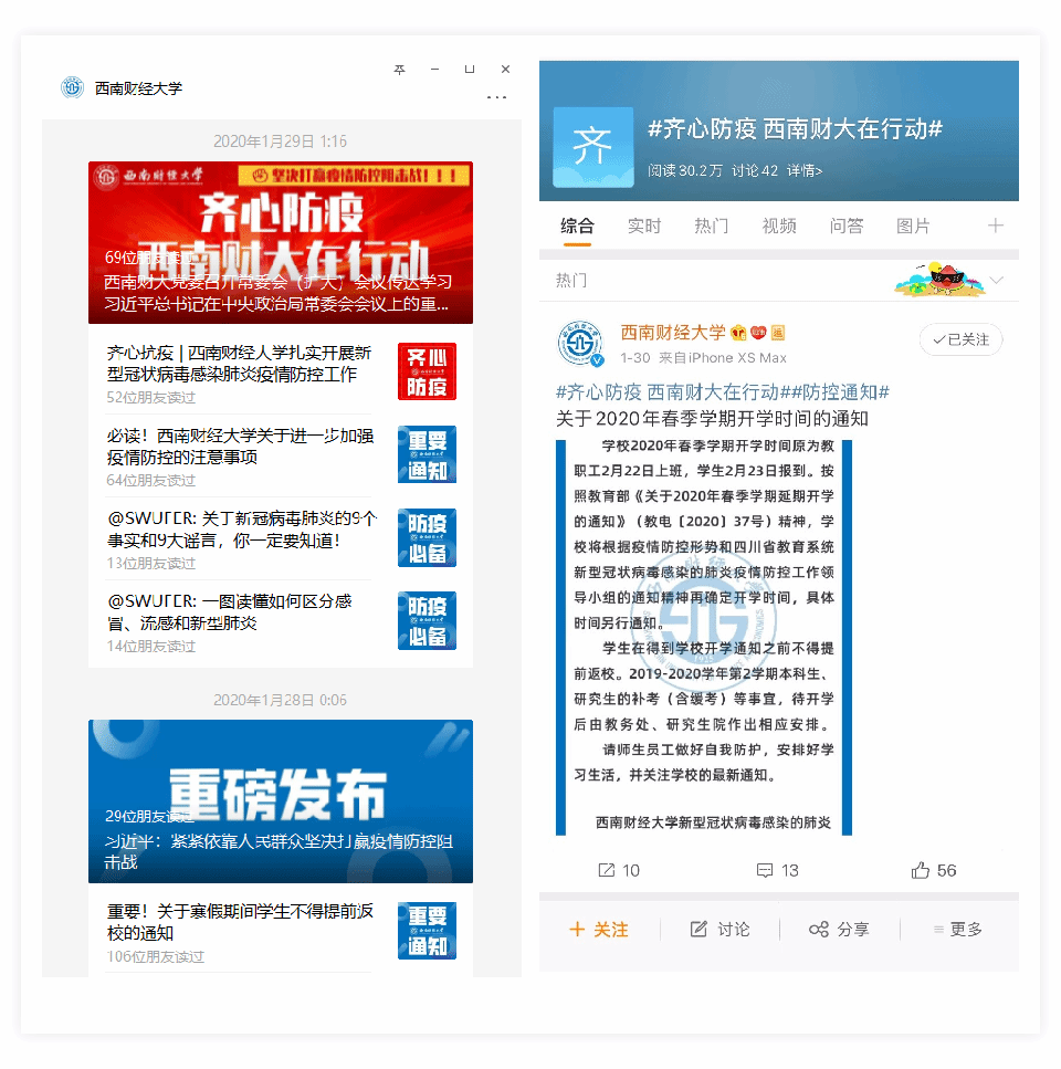 着力强化宣传教育,凝聚人心。坚持主动发声,大力宣传习近平总书记重要指示精神,宣传党中央国务院的决策部署和教育部党组、四川省委省政府安排部署,报道学校防控动态和有力举措,科普知识,先进典型等,把学校党委的关怀送达到每一位师生,学校各项举措让每一位师生知晓。在学校主页开设专题,累计编发报道50余条,官微官博相关阅读量分别累计突破8万和40万;#齐心防疫 西南财大在行动#话题阅读量突破27万。制作科普宣传传单1200份,宣传展板3套42块,为坚决打赢疫情防控阻击战凝聚最大共识。