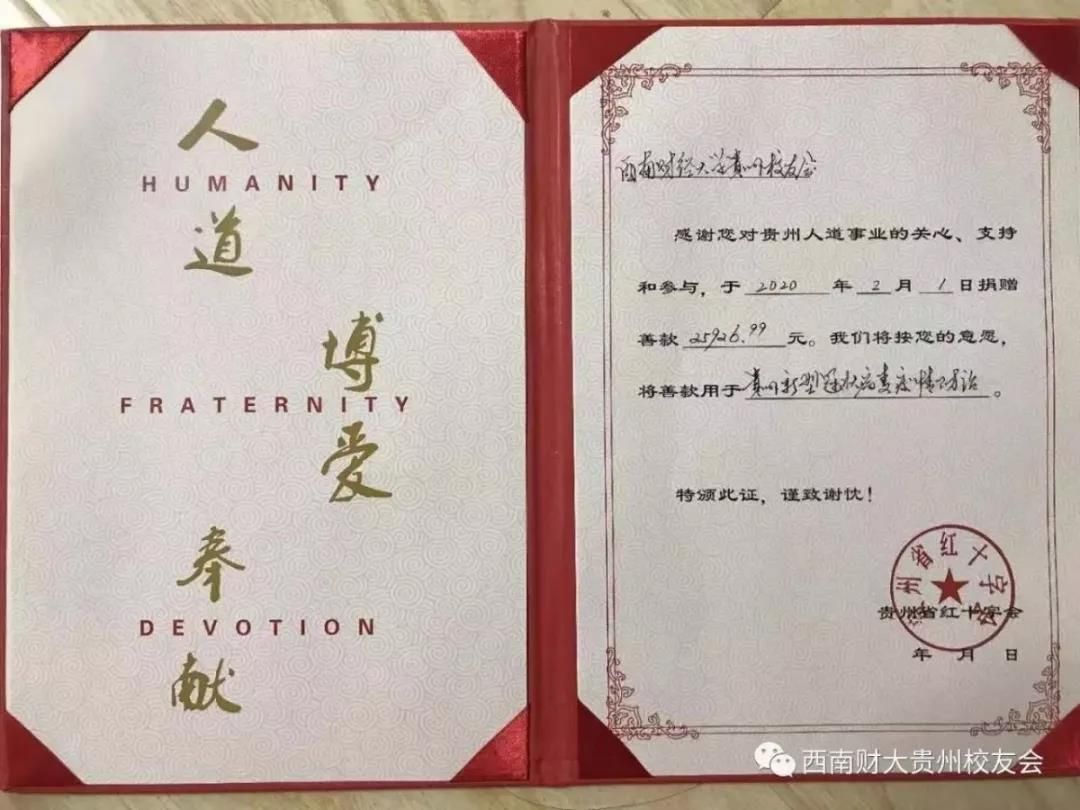 在贵州,贵州校友会发出募捐倡议:“积极行动起来,伸出援助之手,力所能及为抗击疫情贡献力量!”短短3天时间,专门用于“新冠肺炎防治”的2.6万元爱心资金捐赠到贵州省红十字会账户。