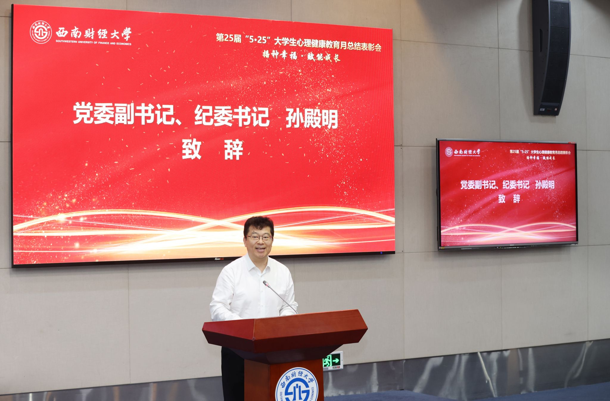 孙殿明代表学校向受到表彰的先进集体和优秀个人表示祝贺。他强调,要站在为党育人、为国育才战略高度和强国建设、民族复兴全局高度,做好顶层设计,推动“五育并举”。要深入推进心理健康教育传统优势与人工智能深度融合,促进心理育人工作集成化数字化品牌化。要聚焦学校第十四次党代会精神和“新财经”人才培养方案,凝聚各方力量,做好系统工程,精准施策、协同推进,护航学生心理健康成长。