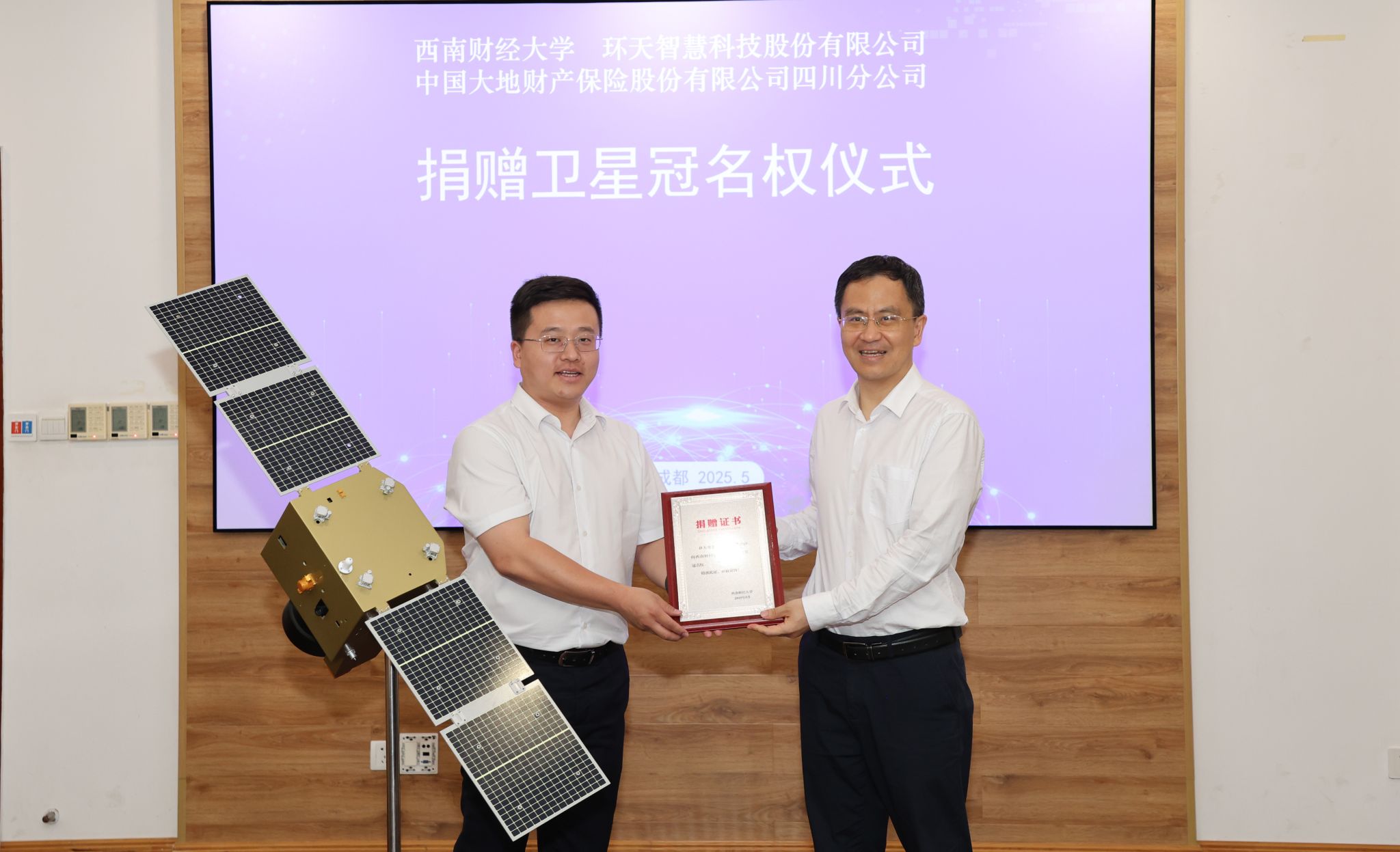 卫星冠名仪式上,环天智慧向学校捐赠卫星冠名权和模型,学校颁发捐赠证书。此次合作是对西南财大的科技献礼,开创了金融保险跨界融合新模式,将为加速我国保险业数字化、智能化转型,加快金融强国建设注入新动能。