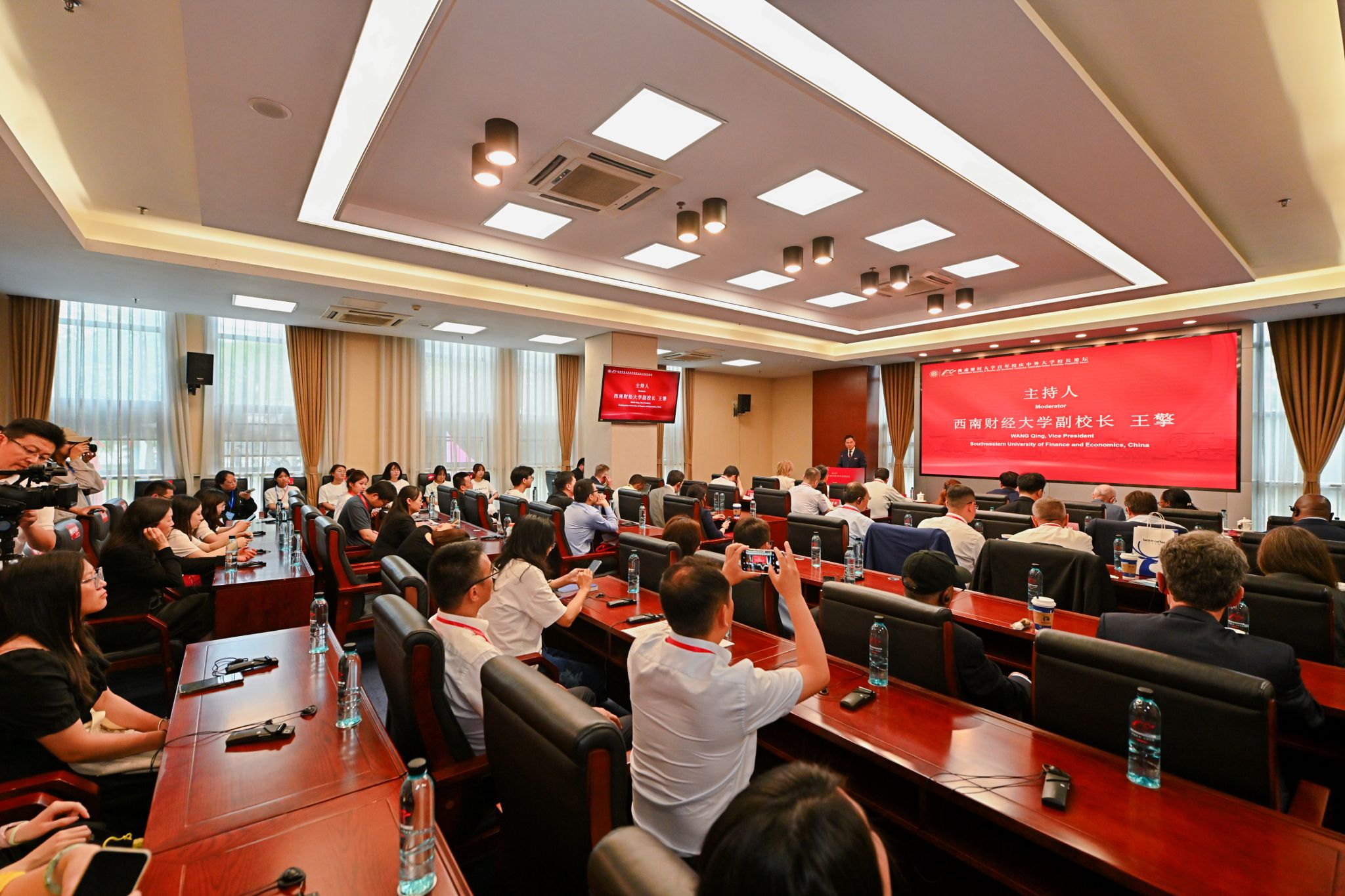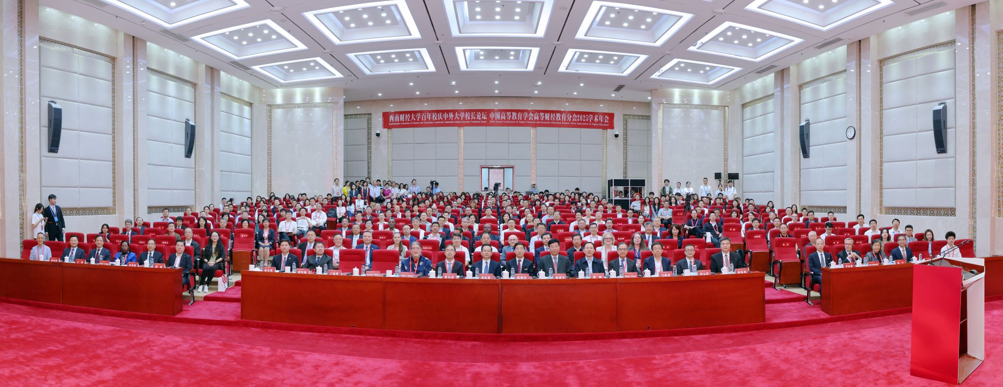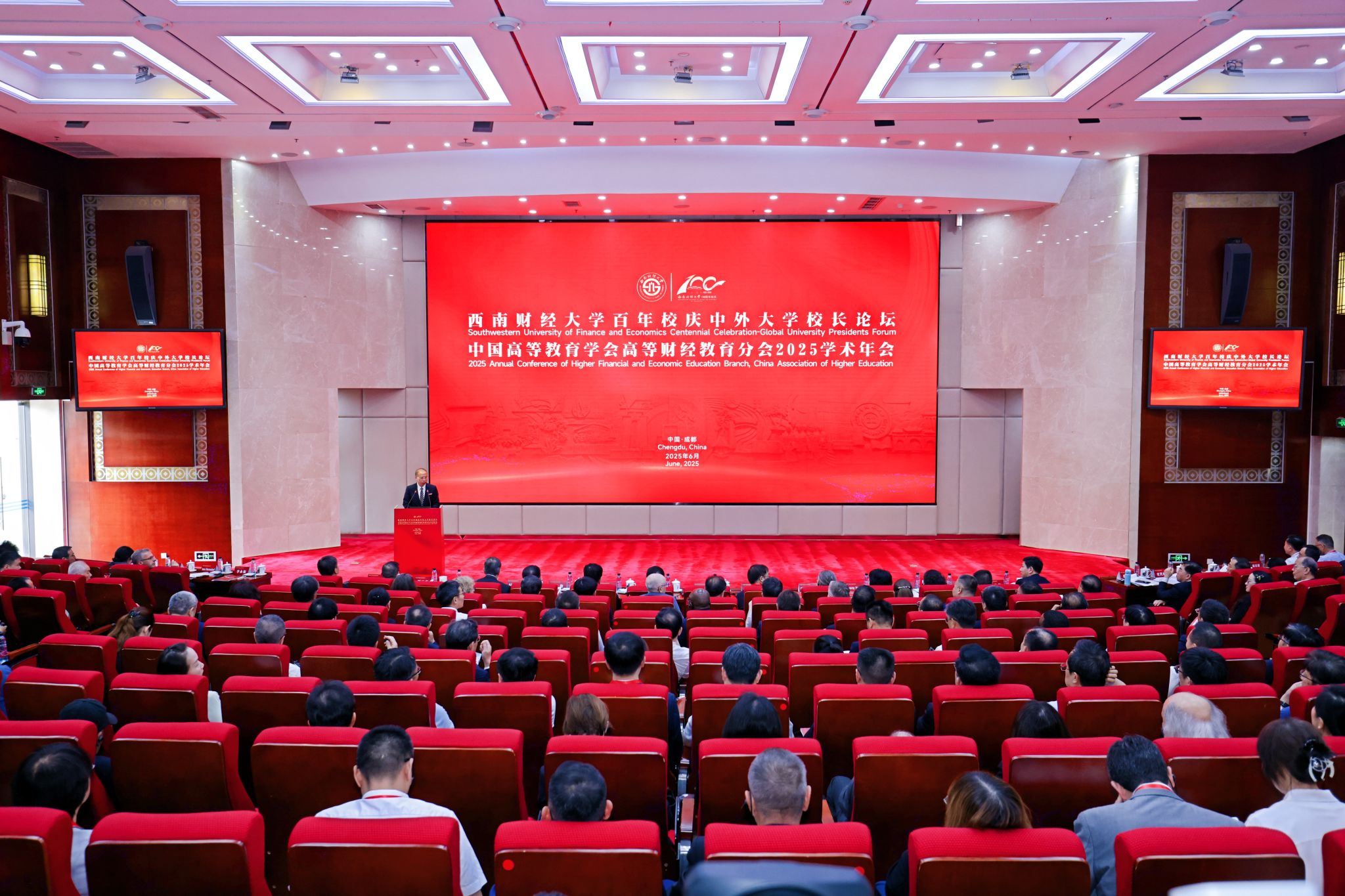 6月1日,西南财经大学百年校庆中外大学校长论坛、中国高等教育学会高等财经教育分会2025学术年会在西南财经大学柳林校区成功举办。全国政协常委、民革中央副主席、中国人口学会学术委员会主任刘家强,中国高等教育学会高等财经教育分会理事长施建军,学校党委书记赵建军出席开幕式并致辞。厦门大学校长张宗益、2022年诺贝尔经济学奖得主菲利普·迪布维格作主旨报告。电子科技大学校长胡俊,北京中医药大学党委书记王瑶琪,中央财经大学校长马海涛,对外经济贸易大学校长赵忠秀,华东理工大学党委书记蒋传海,上海财经大学校长刘元春,中南财经政法大学校长朱方伟,英国剑桥大学原副校长、英国皇家工程院院士大卫·卡德维尔,澳大利亚蒙纳士大学副校长杨爽和来自南开大学、东北大学、南京农业大学、西藏大学、香港中文大学、澳门城市大学、新加坡管理大学、德国柏林财经政法大学等100余所中外知名大学的校领导和专家学者,相关职能部门负责人代表、中学校长代表、学校校友代表,学校师生代表等参加会议。学校党委副书记、校长李永强主持开幕式。