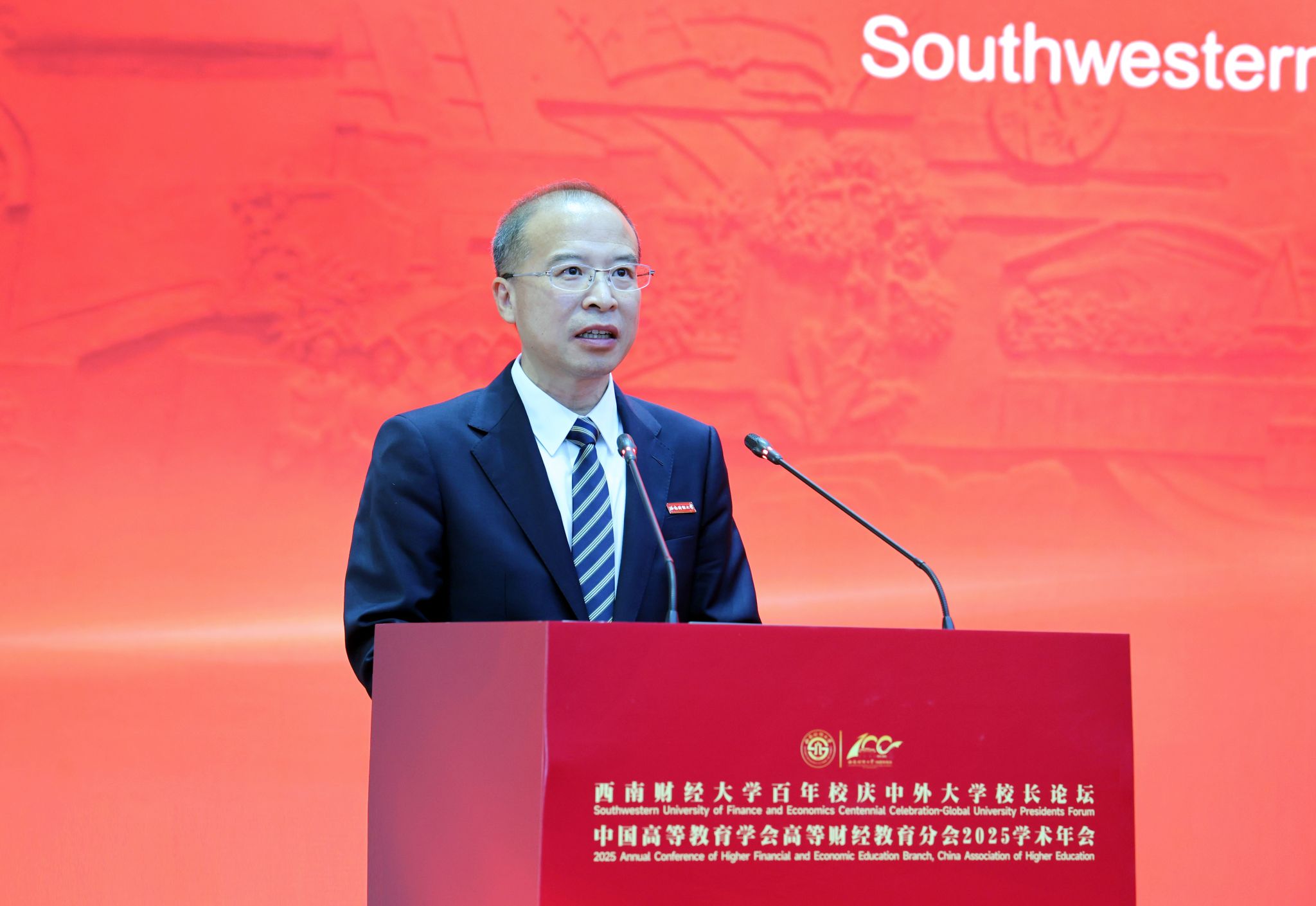 施建军代表中国高等教育学会高等财经教育分会向百年西财致以崇高敬意。他指出,西南财经大学作为我国高等财经教育的重要阵地,始终坚守“经世济民、孜孜以求”,为国家发展和社会进步培养了大批具有国际视野、专业素养与家国情怀的优秀人才。西财百年之路,不仅是一所高校发展历程的缩影,也生动映照出中国高等教育奋进前行的伟大征程。他强调,中国高等教育尤其是高等财经教育必须更加主动拥抱数字化浪潮,推进人才培养模式深度变革,实现教育资源高效配置与个性化供给,增强教育公平性与适应性;加强基础研究、应用研究和技术研发协同联动,加快建构中国自主知识体系,打造具有全球影响力的学术高地和思想高地。