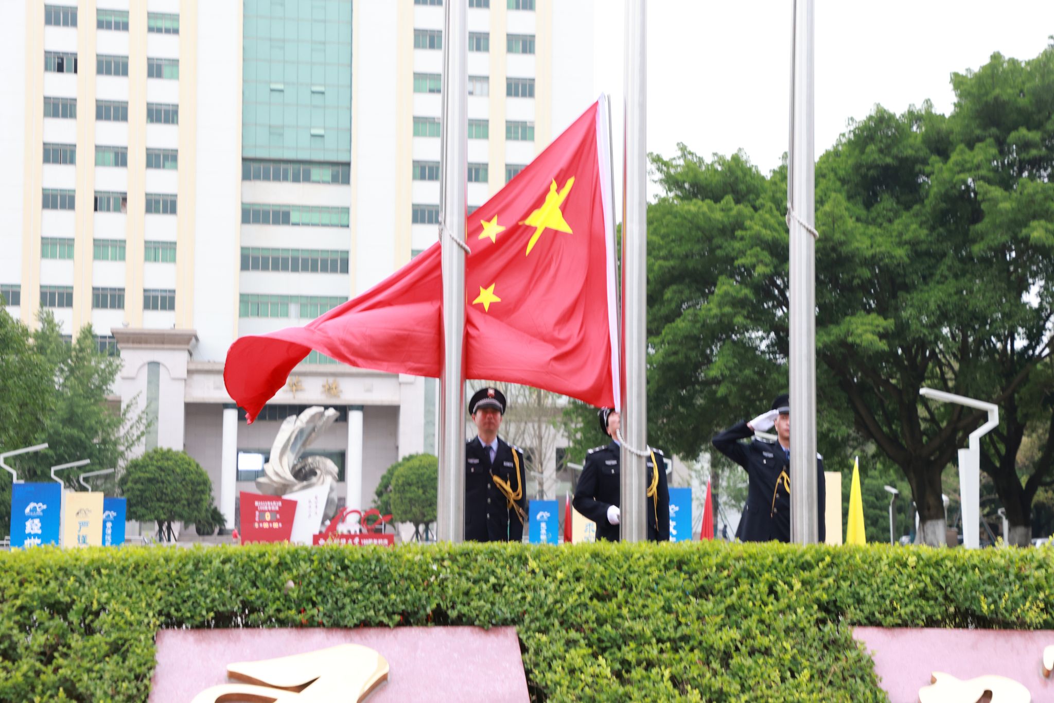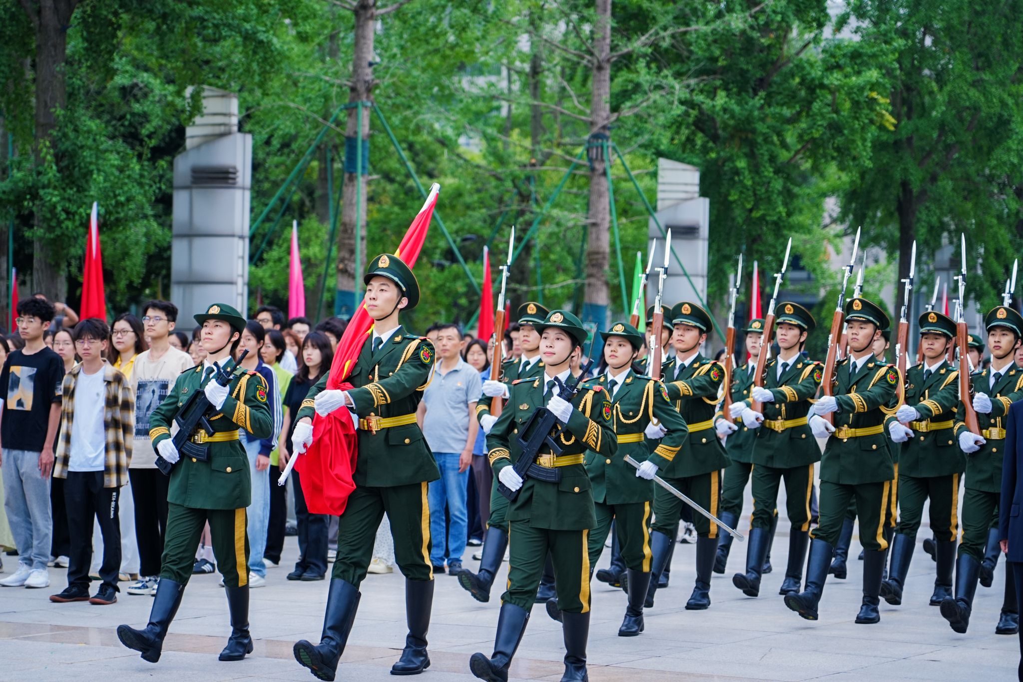 彩旗飘扬、花团锦簇,百年校庆标识绽放华光,在这个盛大的日子里,校园处处洋溢着喜庆的氛围。上午7时15分,升国旗仪式准时开始。国旗班旗手踏着铿锵有力的步伐护送国旗入场,伴随着庄严雄壮的《义勇军进行曲》,鲜艳的五星红旗在西南财大崭新百年冉冉升起,炽红的旗帜在晨风中舒展,犹如跳动的火焰辉映朝阳,在场师生怀着激动喜悦的心情,一同高唱国歌,注目凝望,强烈的自豪感与使命感在西财人的心间澎湃滋长。