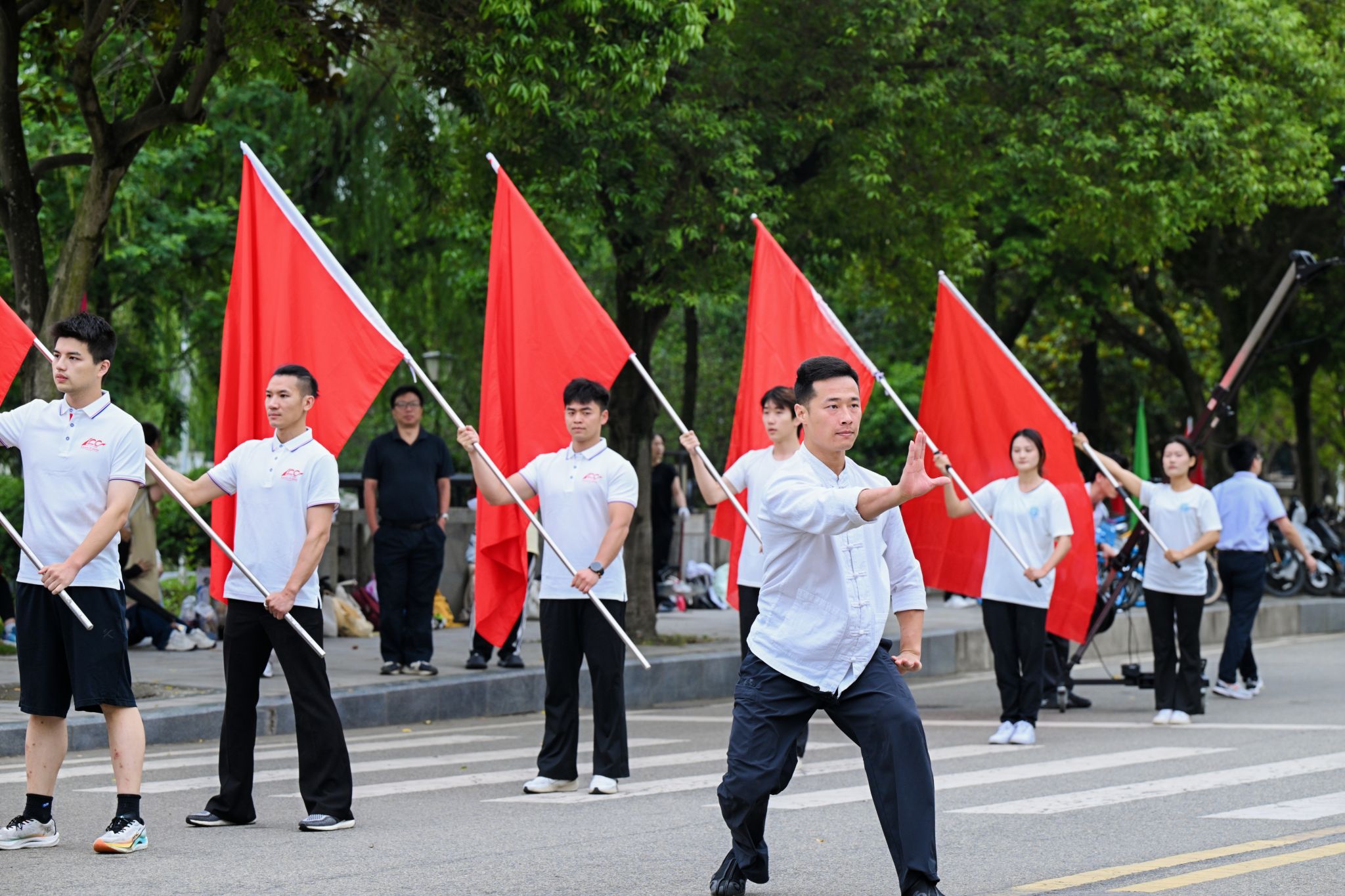 柳林校区腾骧楼前,教师刚劲有力的武术表演和学子奋力挥舞的旗帜交相辉映,在“强国建设、西财担当”“祝百年西财生日快乐”的声声礼赞中汇聚昂扬起“巍巍学府,世纪荣光”的磅礴情怀。
