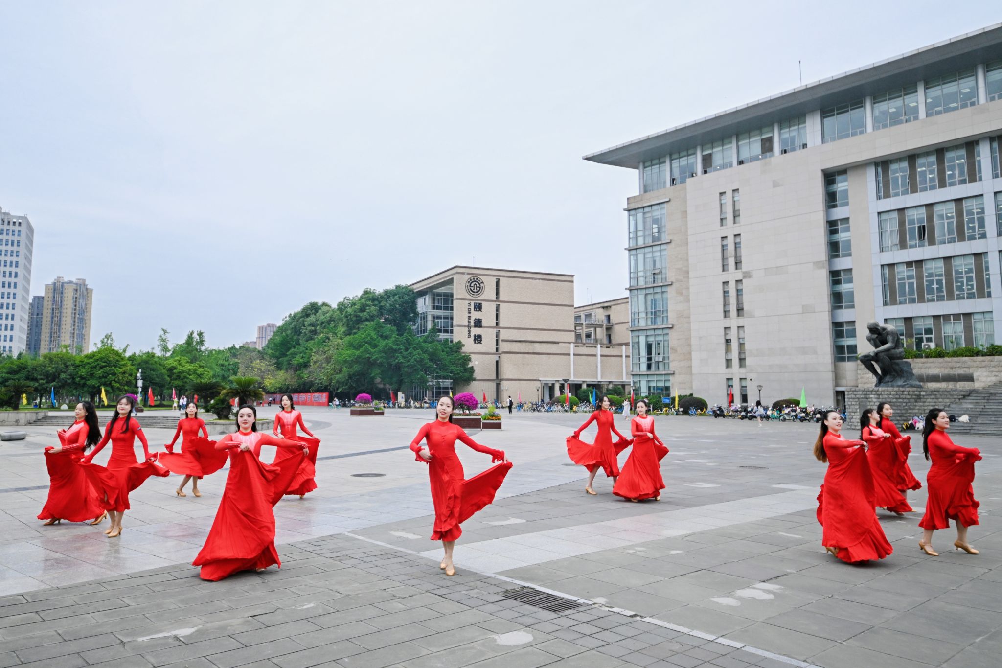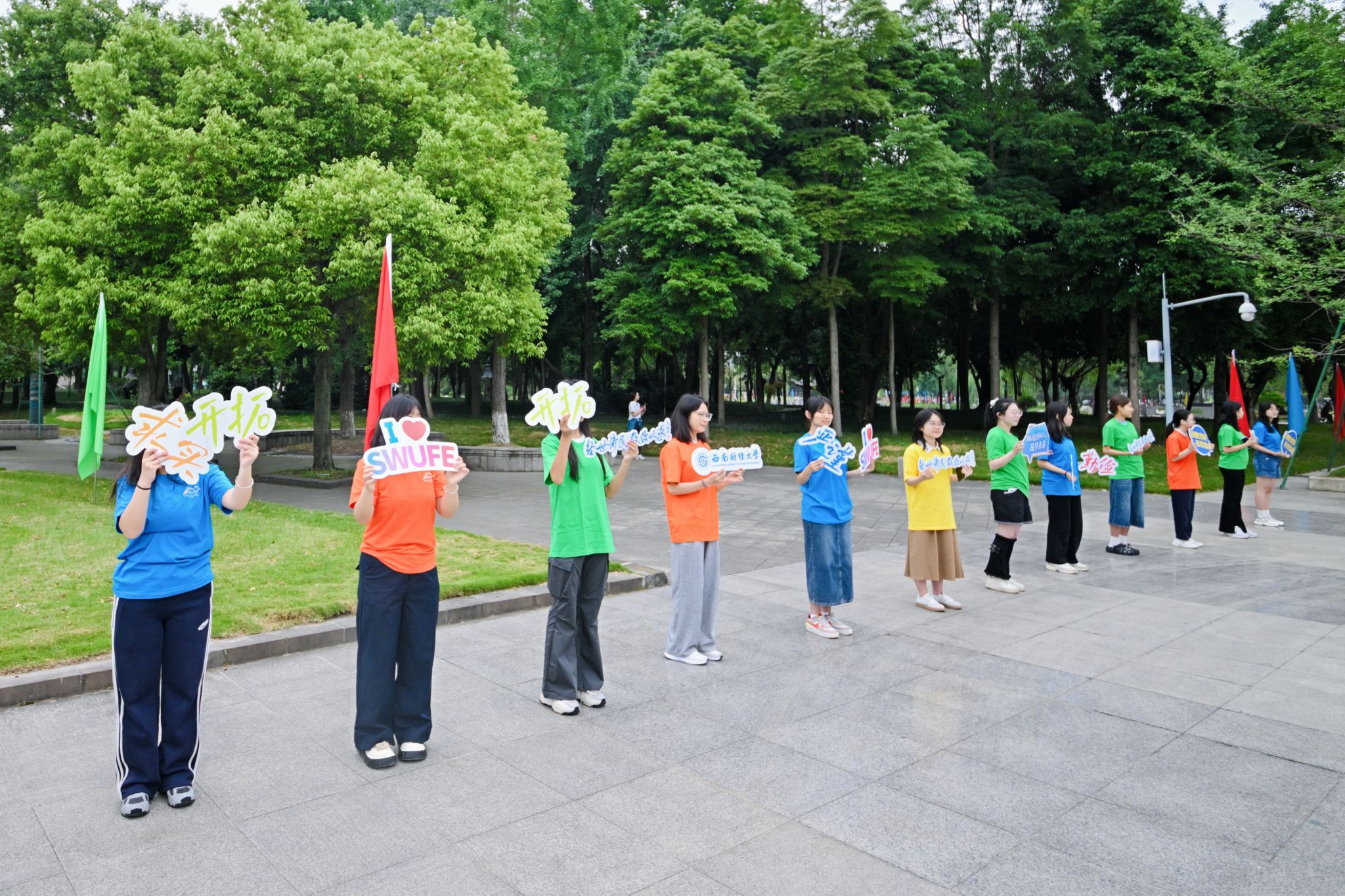 队伍环绕济民广场而行,10余位西财师生身着红裙翩翩起舞,裙摆飞扬间、激昂乐音中,尽显对学校百年华诞的热忱庆贺。经世楼前,年轻的朋友们列队为大家加油鼓劲,鞭策着全体西财人以更加饱满的姿态启航新百年。道路两侧彩旗猎猎,师生们步履铿锵,满怀加快建设财经特色鲜明的世界一流大学,为加快建设教育强国、金融强国贡献更大西财力量的壮志豪情迎向胜利的终点。