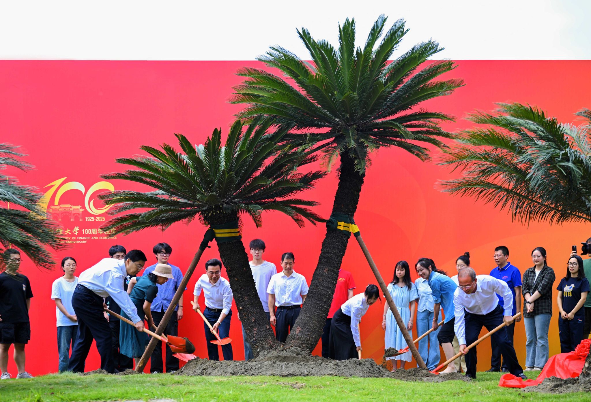 铁树下赵建军即席讲话,分享了刘诗白校长题名柳林铁树的深意,代表学校向老先生致以崇高敬意。他指出,栽种柳林铁树是一份对历史的传承,86年前谢霖先生在光华校区亲手种下一株“V”形铁树,祈愿抗战胜利。从光华到柳林,两棵铁树跨越时空,共同守护历史根脉、传承西财精神、筑梦美好未来。这是一份对大师的崇敬,光华铁树由谢霖先生亲手种下、柳林铁树由刘诗白校长亲自提笔命名,寓意西财学脉绵延、师道传承。这是一份对未来的期许,刘诗白校长特意委派亲属代表与师生一起种下这株铁树,饱含着全体西财人对新百年的憧憬,激励着西财人勇往直前,创造更加美好的未来。最后,赵建军勉励师生们凝心聚力、团结奋进,在中国式现代化的伟大征程上跑出属于新一代西财人的加速度、好成绩。