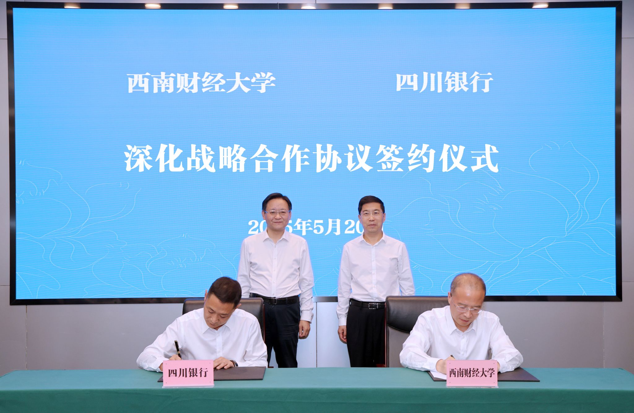5月20日,学校与四川银行深化战略合作协议签约仪式在柳林校区举行。四川银行党委书记、董事长郑晔,党委副书记、行长王波,党委副书记程永革;学校党委书记赵建军,党委副书记、校长李永强,党委常委、副校长桂富强、王擎出席签约仪式。