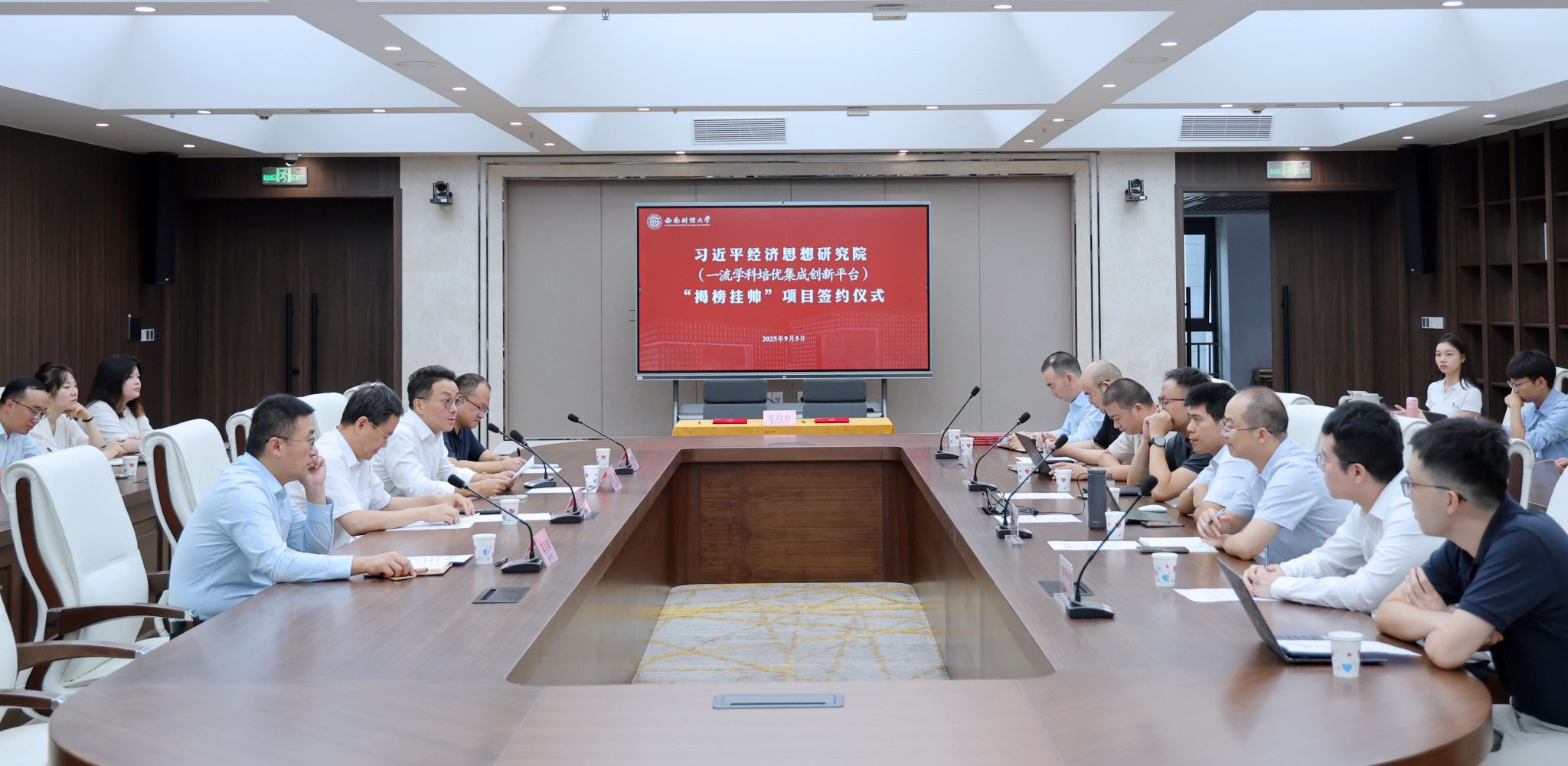 9月5日上午,习近平经济思想研究院在柳林校区诚正楼324会议室举行项目签约仪式,“揭榜挂帅”首批项目正式立项。学校党委常委、副校长、研究院院长王擎出席活动并致辞,研究院执行院长贾晋主持仪式,西南财经大学出版社和首批四个项目团队负责人、联络员参加仪式。