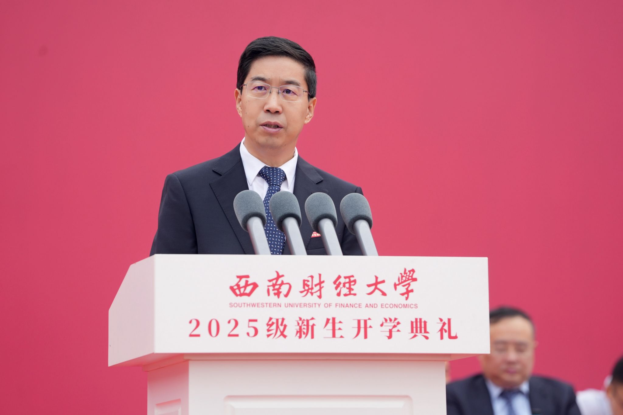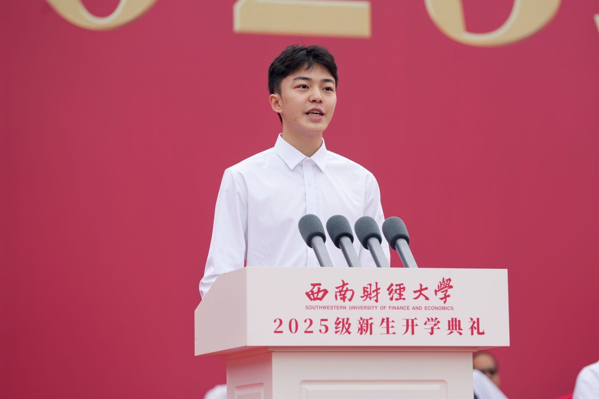 新生代表罗司锐发言,号召全体新西财人一同在充满荣耀和辉煌的百年学府中汲取智慧勇气、感受人文温度、激发探索热情、坚守报国初心,勇毅前行,共同开启西财独家记忆,写下独属于自己的青春答卷。