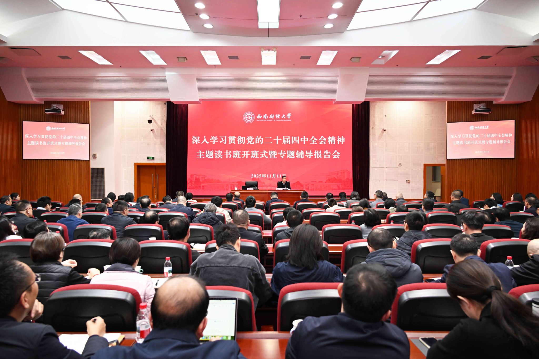 赵建军强调,本次主题读书班是学校党委深入学习贯彻党的二十届四中全会精神的创新举措,注重将学习全会精神与推动学科发展相结合、校内专家辅导与校外专家讲授相结合、集中学习与日常学习相结合、线下集中与线上直播相结合、学习与研讨相结合,确保学深悟透、走深走实。赵建军要求,全校各级党组织和广大党员干部、师生员工要认真学习思考,原原本本、逐字逐句认真研读习近平总书记重要讲话精神和《建议》原文,在学习中深入思考“强国建设、西财何为”。要开展集中研讨,围绕全会精神贯彻落实和学校“十五五”规划编制,结合工作实际开展专题研讨,推动学习成果向工作实践有效转化。要加强研究阐释,自觉在全会重大部署中找方向、找课题、找方法,强化有组织科研,力争产出一批有影响力的标志性成果。要抓好规划编制,将全会精神融入学校“十五五”规划编制全过程,指导学校“十五五”时期事业高质量发展,为深入推进“双一流”建设,推动财经特色鲜明的世界一流大学建设迈上新台阶提供坚实保障。