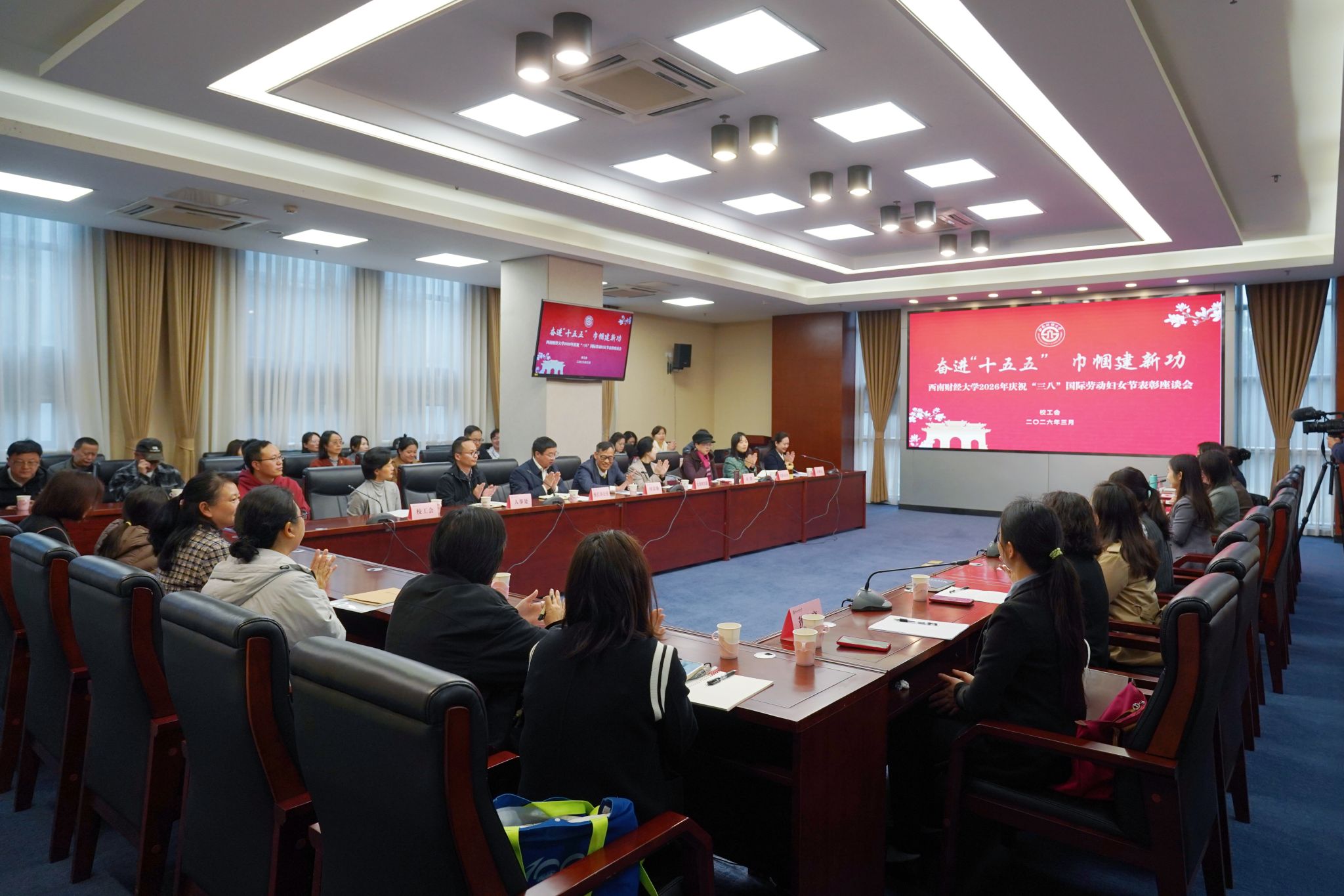 3月6日上午,学校2026年“三八”国际劳动妇女节表彰座谈会在弘远楼109会议室举行。会议以“奋进‘十五五’ 巾帼建新功”为主题,党委常委、副校长、工会主席桂富强,劳模代表、先进个人,相关职能部门负责人、女工委委员、院级工会主席等参加会议。校工会负责人主持会议。