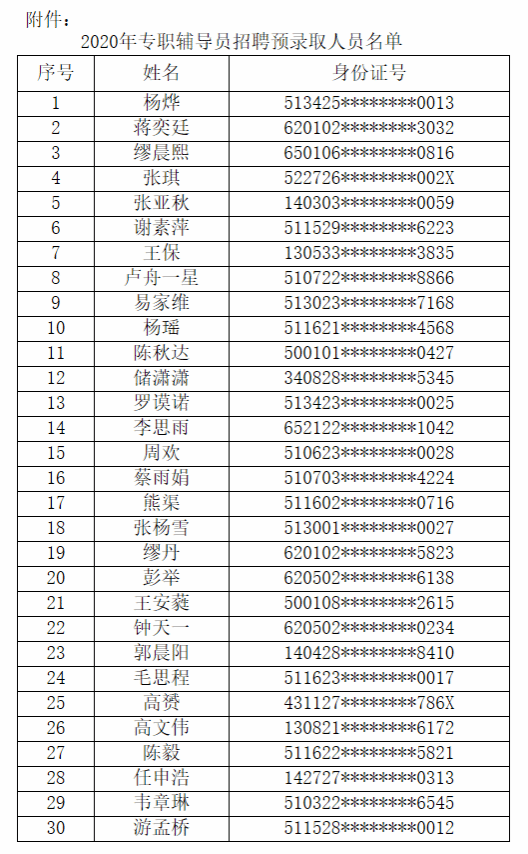 根据公开招聘笔(面)试情况,经学校研究,决定预录取杨烨等30人参加学校统一组织的实习,考核合格后录取为我校专职辅导员,具体名单见附件。