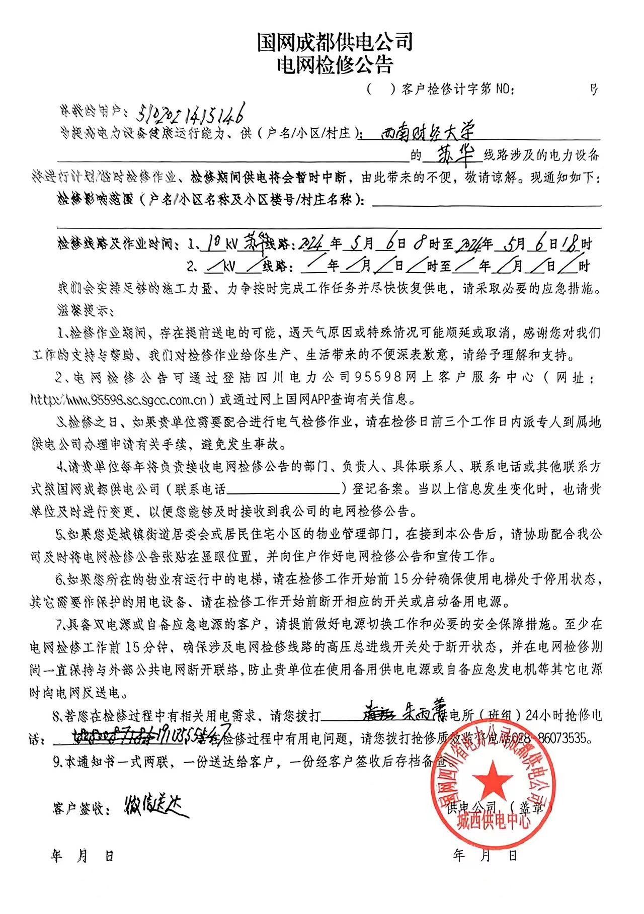 接城西供电中心通知,因负荷改接,光华校区将于5月6日停电。