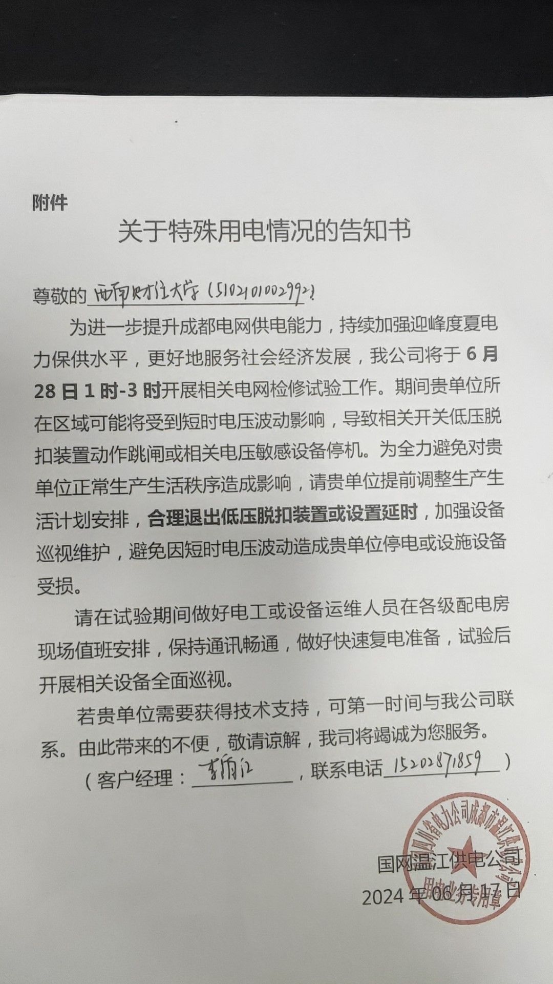 接供电公司通知,6月28日(星期五)凌晨1时—3时,开展成都电网检修试验工作,期间可能因电压波动造成停电。届时,后勤服务总公司将组织人员及时恢复正常供电。