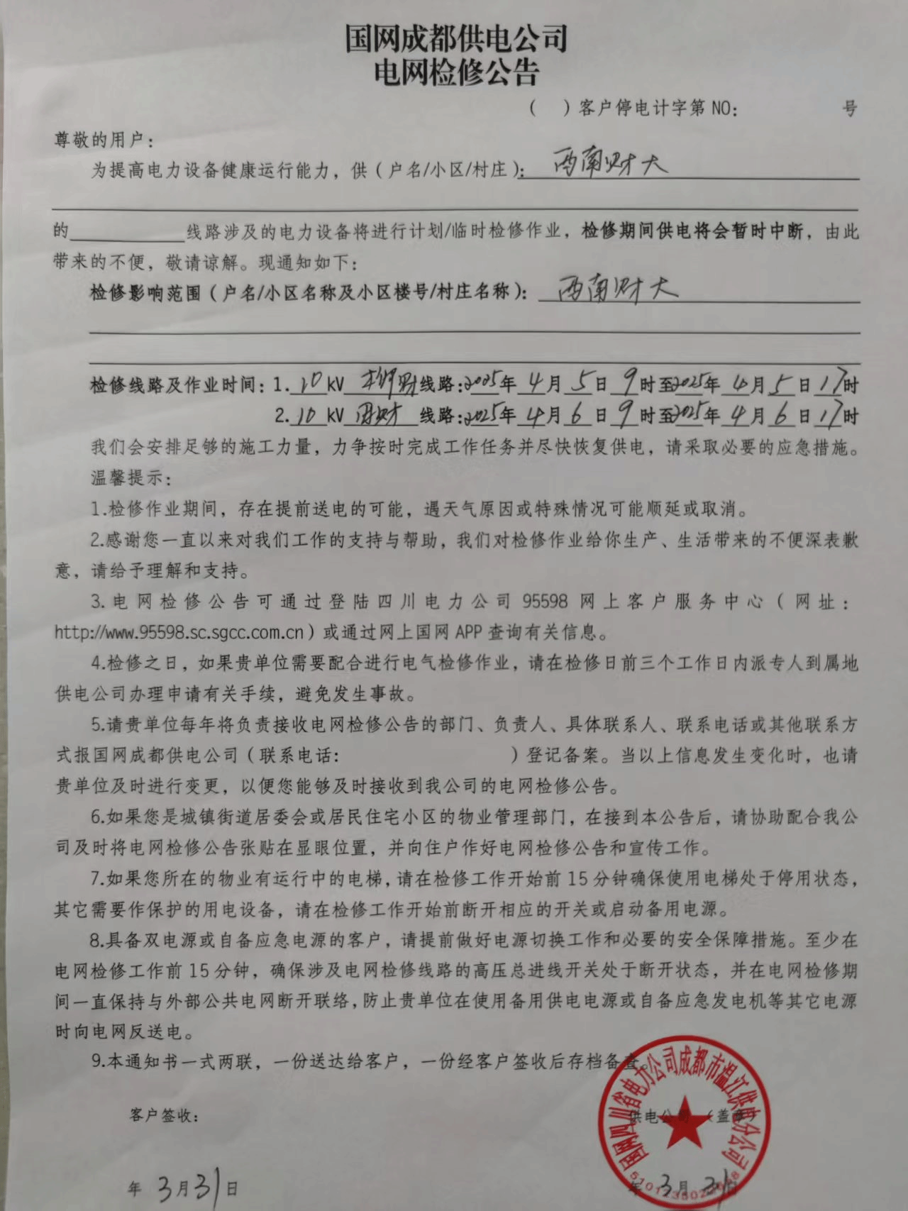 特别提示:停电期间,电梯和空调停止运行。由此给您带来的不便,敬请谅解!