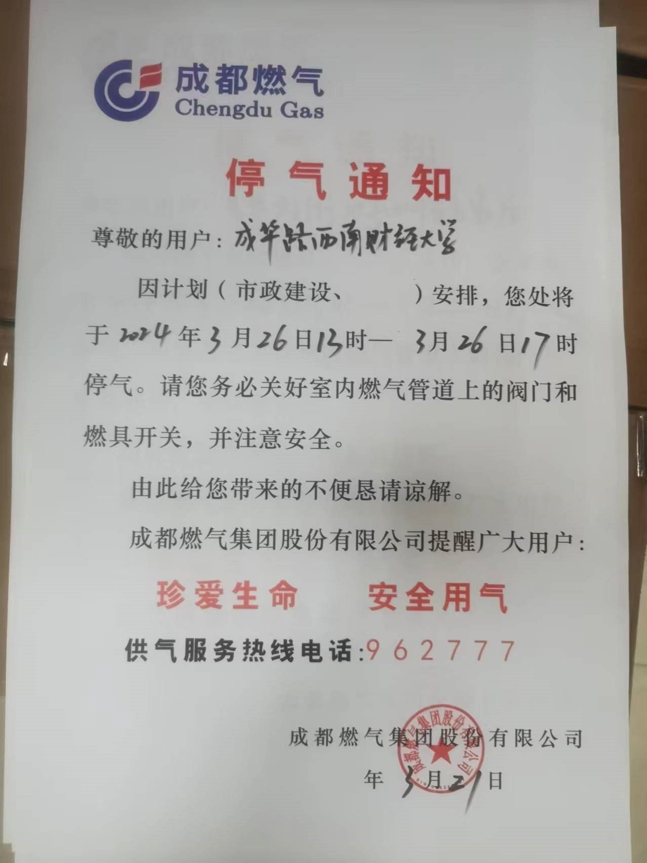 接成都燃气公司通知,因市政建设,导致光华校区临时停气。