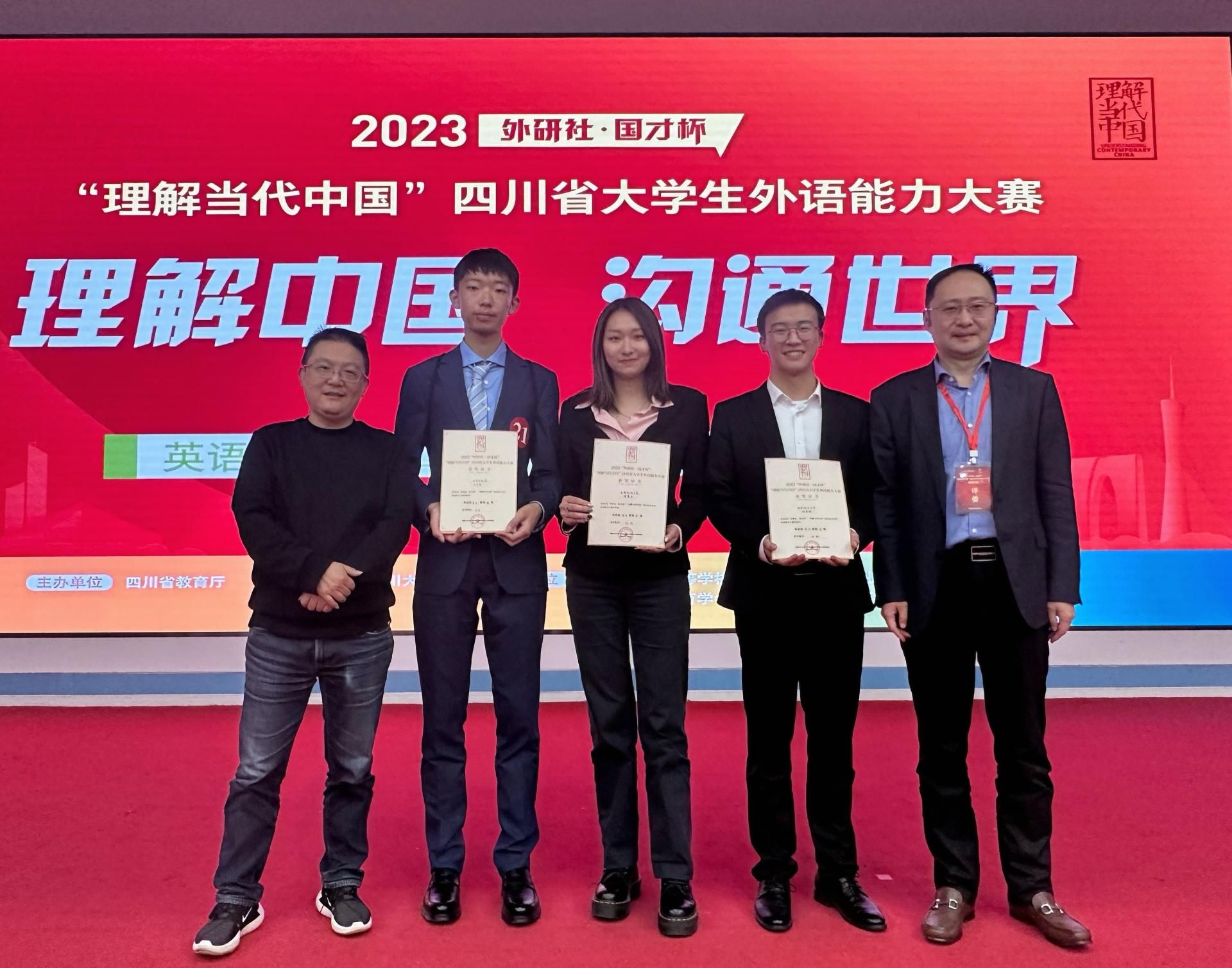 11月6日,2023“外研社·国才杯”“理解当代中国”全国大学生外语能力大赛四川省复赛于四川大学望江校区正式举行。在外国语学院孙林老师的指导下,我校学子2023级英语口译专业胡盛强、2022级会计学(中外合作办学)黄楚玉、2023级会计学(中外合作办学)吕呈悦经过两轮鏖战,以其清晰的思路、严密的逻辑、生动的语言、自如的表达最终斩获佳绩。黄楚玉荣获全场冠军,胡盛强荣获金奖,成功晋级全国总决赛,吕呈悦荣获四川省银奖。