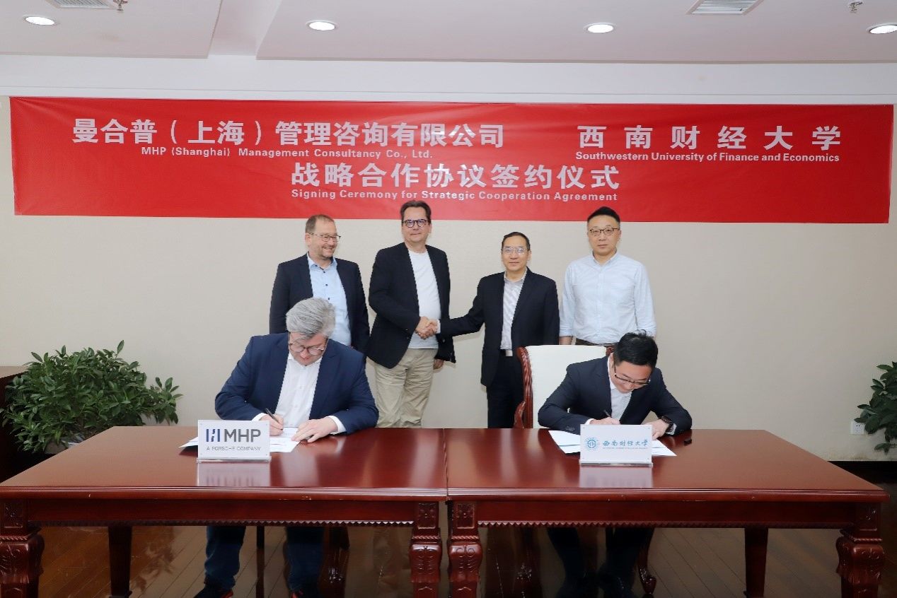 4月23日下午,我校与保时捷子公司曼合普(上海)管理咨询有限公司(以下简称“MHP”)战略合作协议签约仪式在柳林校区腾骧楼5楼会议室举行。MHP首席财务官、董事会成员Marc Zimmermann,MHP国际部总裁、董事会成员Dr. Oliver Oswald,中国区首席执行官Thomas Mooser等,学校党委常委、副校长史代敏,工商管理学院院长王珏、副院长廖毅等双方代表出席仪式。