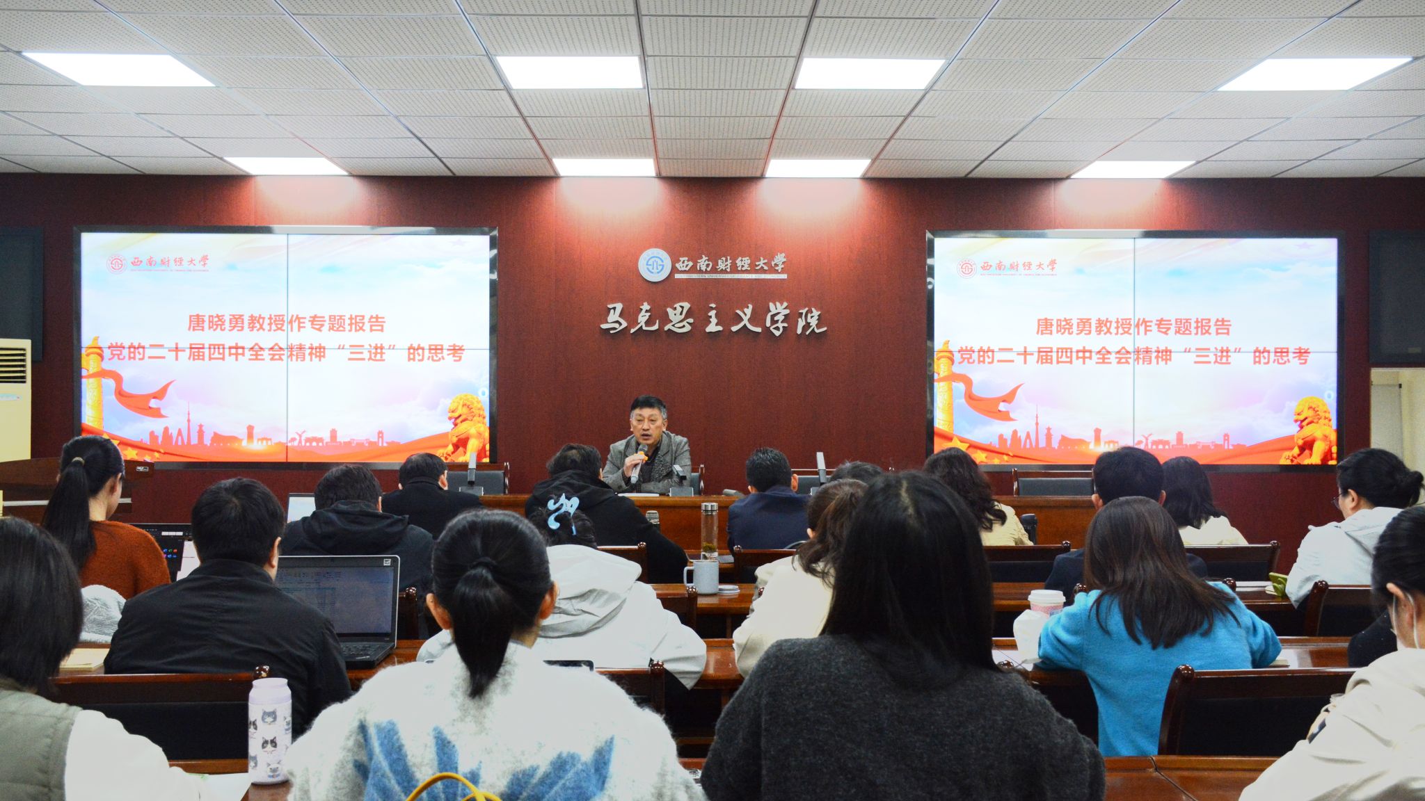 唐晓勇教授围绕本次会议主题作辅导报告。他指出,要系统完整准确把握四中全会精神的核心要义,特别是要深入学习领会本次全会提出的新概念、新观点、新论断,深刻领悟贯穿全会的马克思主义立场、观点、方法,把思想和行动统一到全会精神上来。唐晓勇结合思政课教学提出推进全会精神“三进”的工作思路。