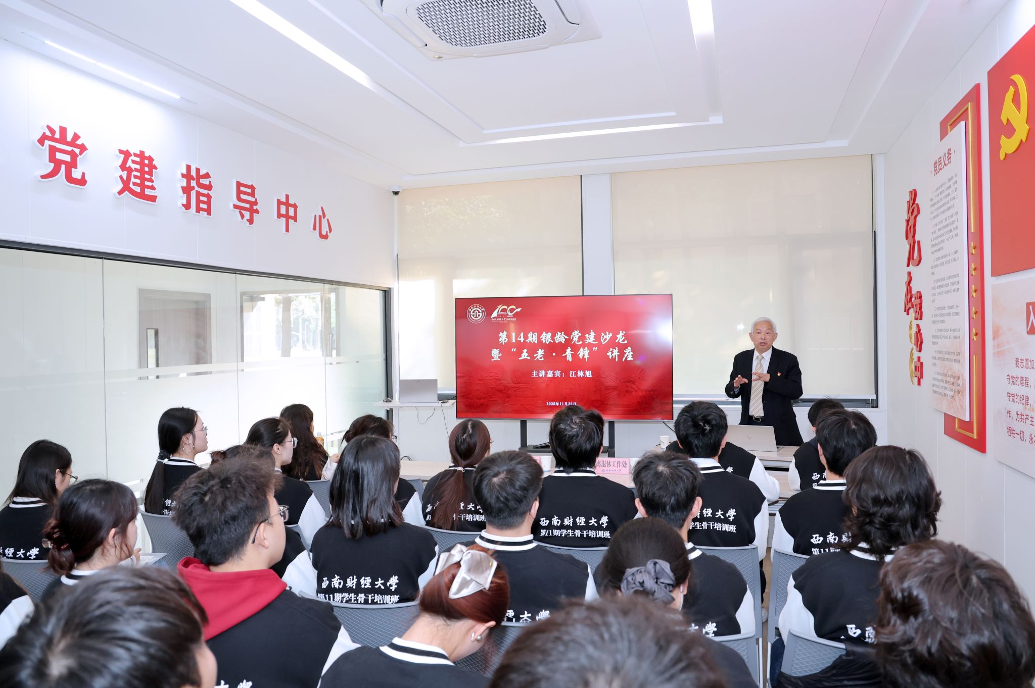 11月25日,学校在光华校区“一站式”学生事务服务大厅党员活动室举办第14期银龄党建沙龙暨“五老·青锋”专题讲座。学校关心下一代工作委员会副秘书长江林旭以“为深入学习贯彻党的二十届四中全会精神,厚植百年西财情怀底色”为主题,为党建指导中心、第11期学生骨干培训班、“青”系桑榆敬老志愿服务队等80余名学员讲授思政大课。