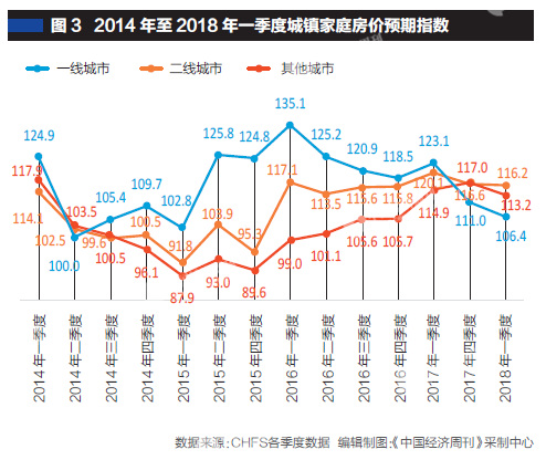 由过去3年数据可知,人们对房价的预期变化较大。2015年城镇居民整体看跌房价,但一年之后转为乐观。从2017年开始,各地政府逐渐对房地产市场进行调控,城镇居民的房价预期指数从2017年一季度的118.1,下降到四季度的116.3,并进一步下降到2018年一季度的113.8,说明国家的房地产市场调控政策发挥了作用。