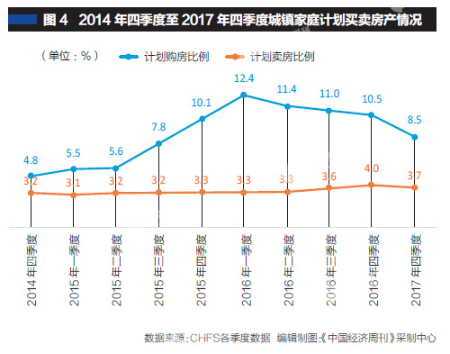 从家庭计划买卖房产情况看,2014年四季度到2016年一季度,计划买房比例持续走高;但2016年一季度为拐点,此后计划买房比例逐渐下跌,到2017年四季度跌至8.5%。而卖房市场一直较稳定,2016年四季度有略微增加,之后稍有回落(见图4)。