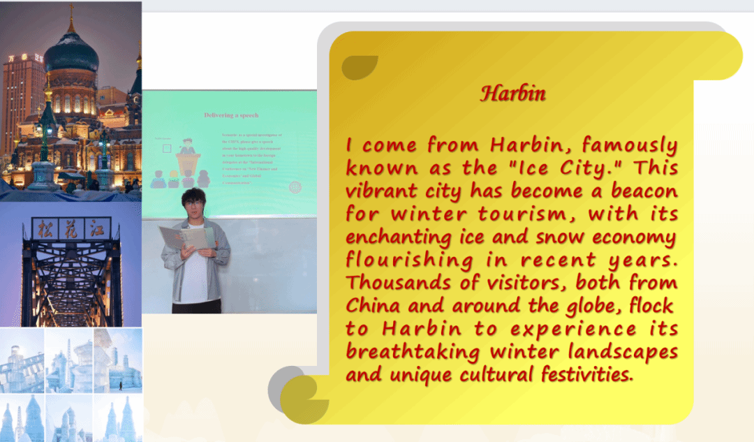 我们的课程设计选择了《理解当代中国:英语演讲教程》第七单元“Promoting High-quality Development(推动高质量发展)”。在这个单元,学生能学习和掌握与中国高质量经济发展相关的英文表达,也能复习和实践英文演讲。但与其他参赛队伍不同,我们更希望在传授英语知识的同时,让学生深入观察自己所处的社会环境,感悟中国经济发展历程中的关键节点与伟大成就,增强民族自豪感和责任感。因此,我们设计了让学生用英语讲述自己家乡发展故事的环节。我至今仍记得在课上,有个学生谈起云南楚雄的生态发展时,眼中闪烁的光芒。也有学生很自豪地讲述了北京电子商务的高速发展。学生们用身边案例讲述着中国高质量发展的故事,也向世界更好地传播中国方案和中国声音。那一刻,我真正理解了什么是“有温度的教学”。