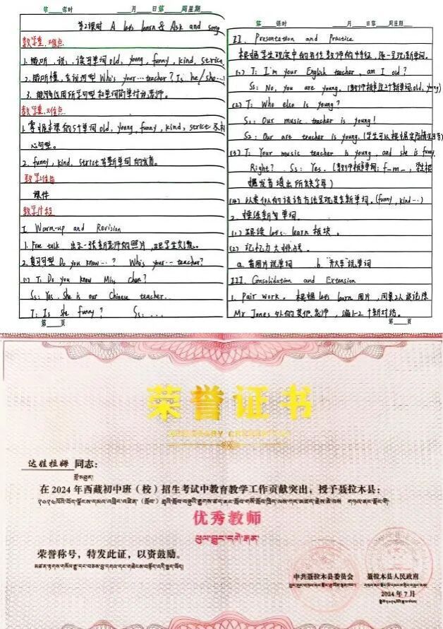作为全科老师,达娃拉姆除了参与各类培训,还积极投身教学赛课。第一次参加县级数学赛课对毫无经验的她堪称一场“脱胎换骨”的挑战,从选题到设计教学流程,每一步都很艰难,教案改了不下十遍,遇到瓶颈就请教同事,经常熬夜调整课件细节……赛课当天虽紧张得手心冒汗,但看到学生积极互动后,达娃拉姆的紧张感消散、自信心增强,最终凭借充分准备和生动课堂呈现斩获一等奖。随着经验逐渐累积、阅历不断丰富,达娃拉姆在已然成为动力的压力中快速成长,教学设计与展示能力得到显著提升。如今的她,不仅荣获县级“优秀教师”称号,所带班级的英语成绩更稳居全县前三,成功从“教学小白”蜕变为学生口中的“全能老师”。