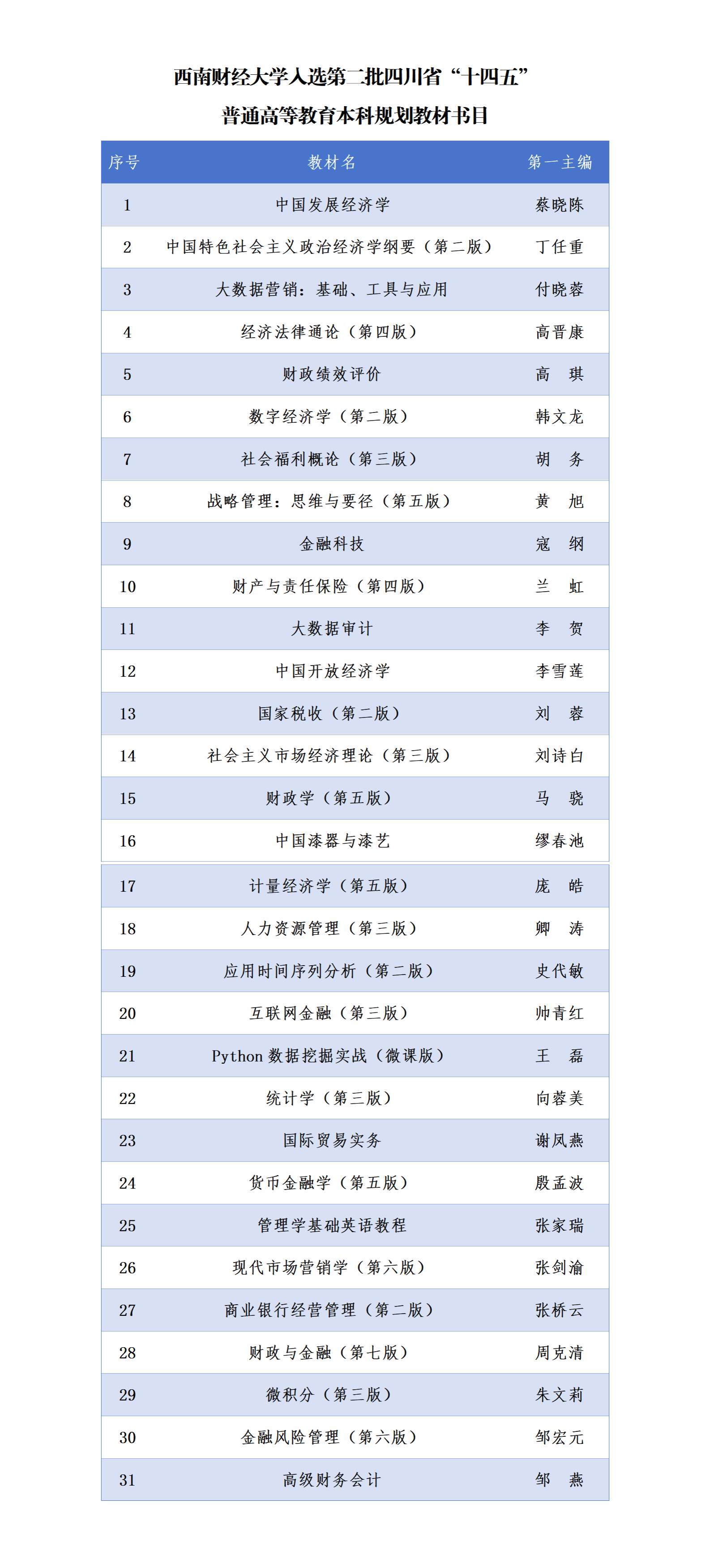 近日,四川省教育厅发布《关于公布第二批四川省“十四五”普通高等教育本科规划教材书目的通知》,我校《中国开放经济学》等31部教材入选,覆盖经济学、管理学、法学、理学等多个学科领域。截至目前,学校共有48部教材入选四川省“十四五”普通高等教育本科规划教材。