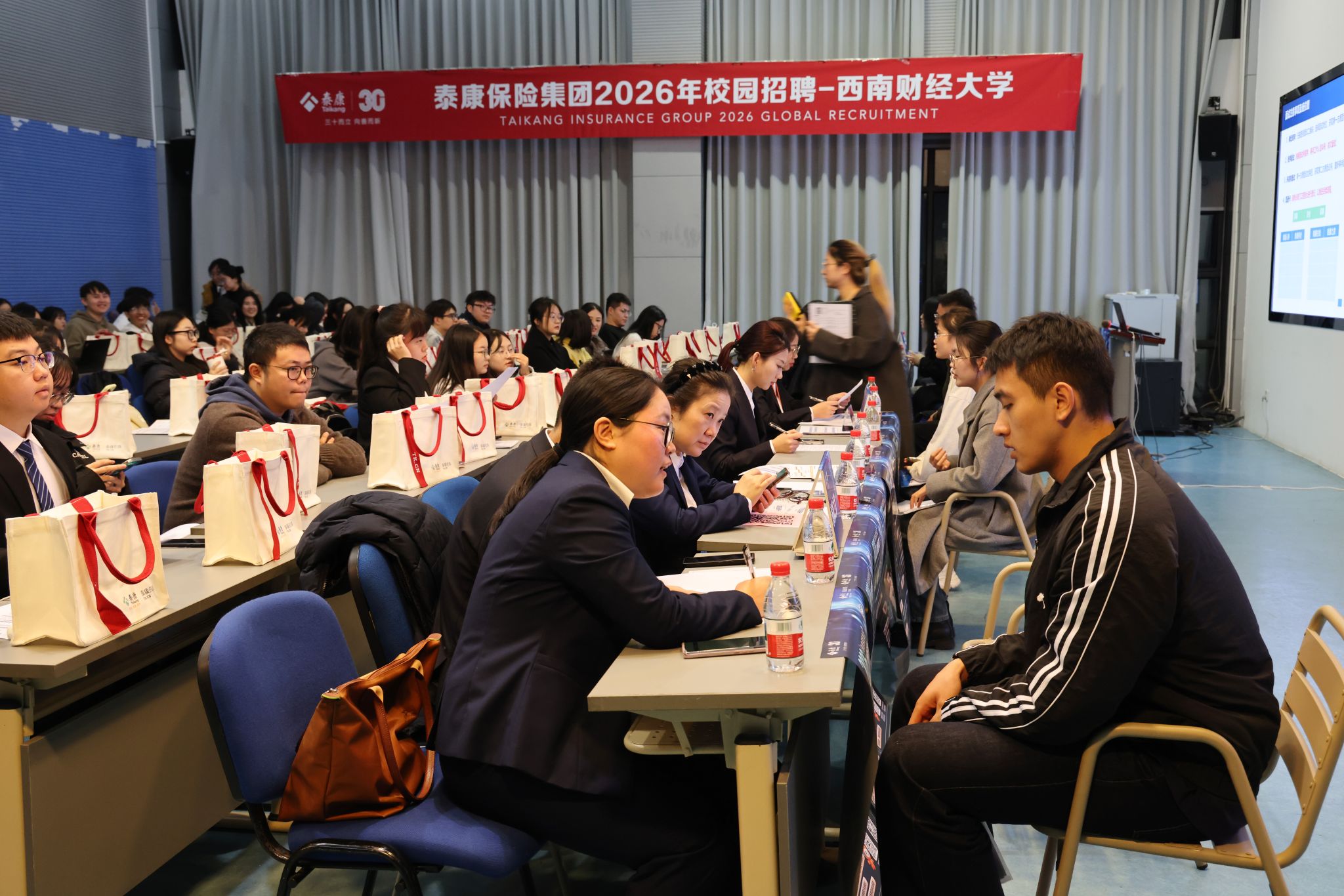 座谈会后,泰康保险集团在学生活动中心视频会议厅开展招聘宣讲活动。泰康在线与泰康人寿四川分公司、泰康养老四川分公司、泰康之家四川分公司组成联合宣讲团,全面展示集团在保险科技、健康养老等领域的创新实践与毕业生需求。