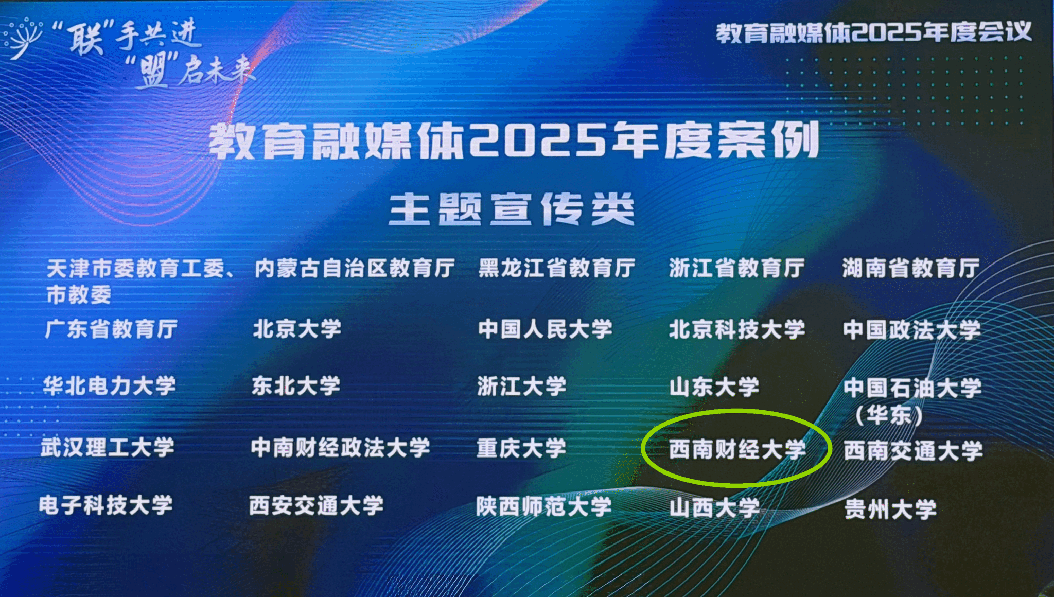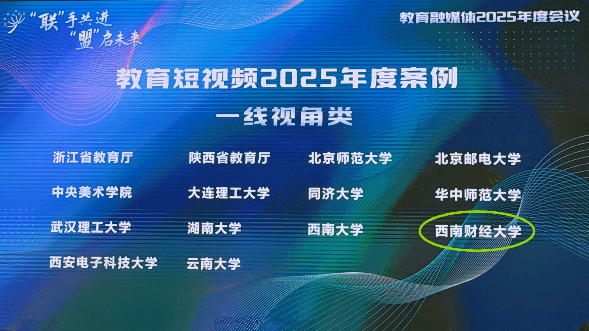 12月16日至17日,教育部宣传教育中心举办教育融媒体2025年度会议,百余家教育融媒体联盟骨干单位齐聚湖南大学,共赴年度之约。会上发布系列奖项,学校报送的《西部热土,西财担当》和《大力弘扬教育家精神,〈西财人〉讲述教育工作者的一线奋斗故事》两个工作案例分别获评教育融媒体2025年度案例、教育短视频2025年度案例,连续两年获此嘉奖。